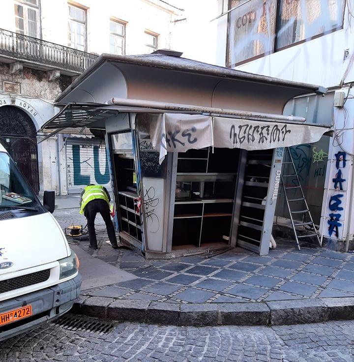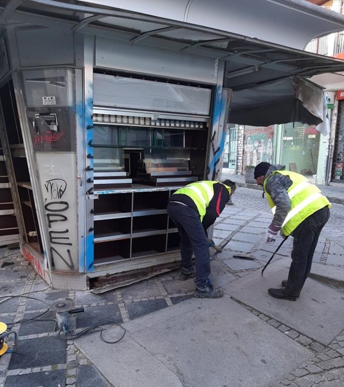 Η αρχή έγινε από το ιστορικό κέντρο της πόλης, όπου τα συνεργεία απομάκρυναν το περίπτερο που βρισκόταν στην συμβολή των οδών Ανεξαρτησίας και Κάνιγγος.