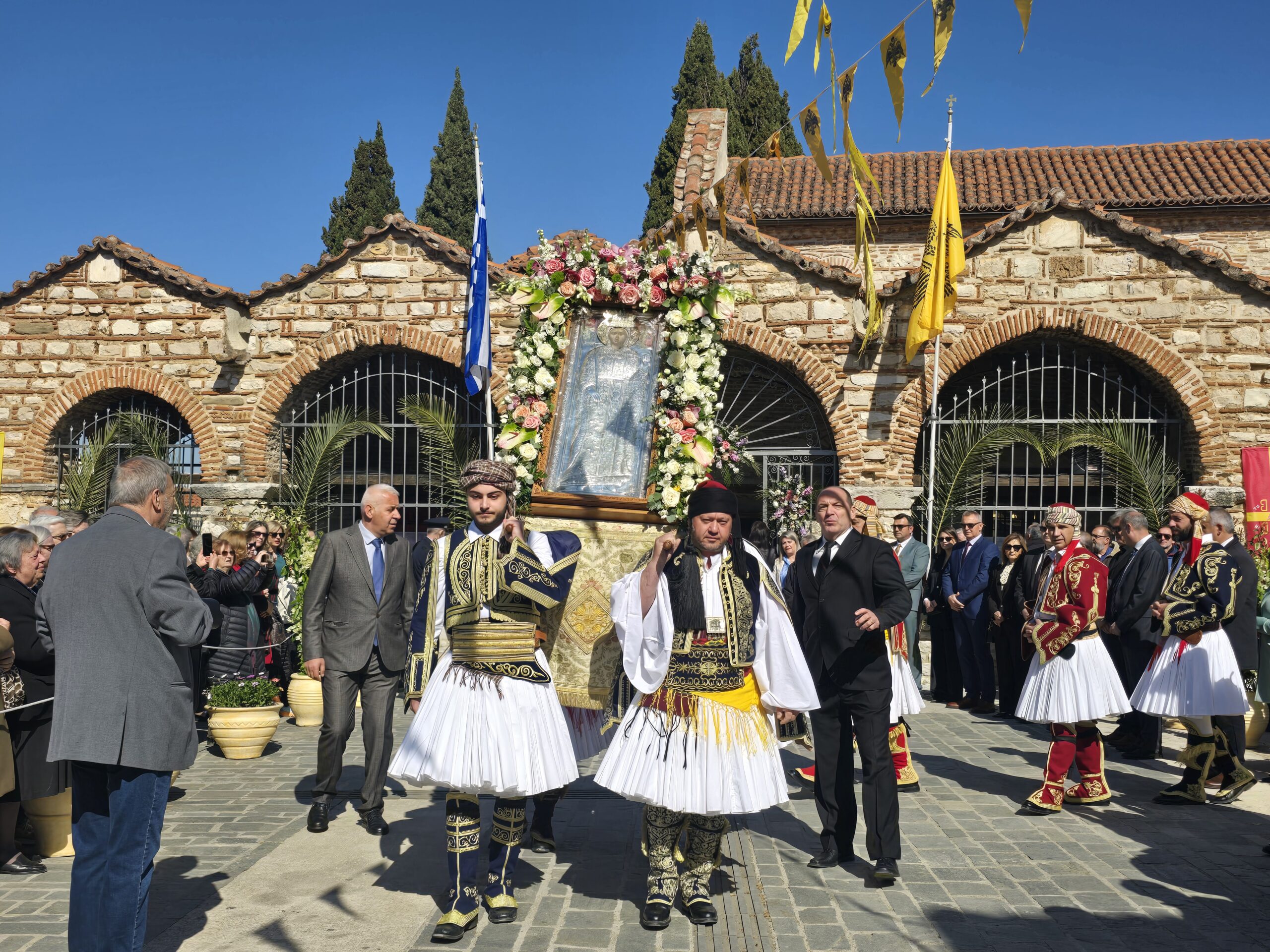 Ακολούθησε η καθιερωμένη λιτάνευση των ιερών λειψάνων και της εικόνας Της, στους δρόμους της πόλης, με τη συνοδεία φιλαρμονικών και τη συμμετοχή των αρχών, στρατιωτικών αγημάτων και πλήθους κόσμου. Ιδιαίτερα συγκινητική στιγμή της πομπής αποτελεί κάθε χρόνο η συμμετοχή των σχολείων και των πολιτιστικών συλλόγων της πόλης οι οποίοι διατηρούν ζωντανό ένα παλιό και βαθιά ριζωμένο έθιμο.