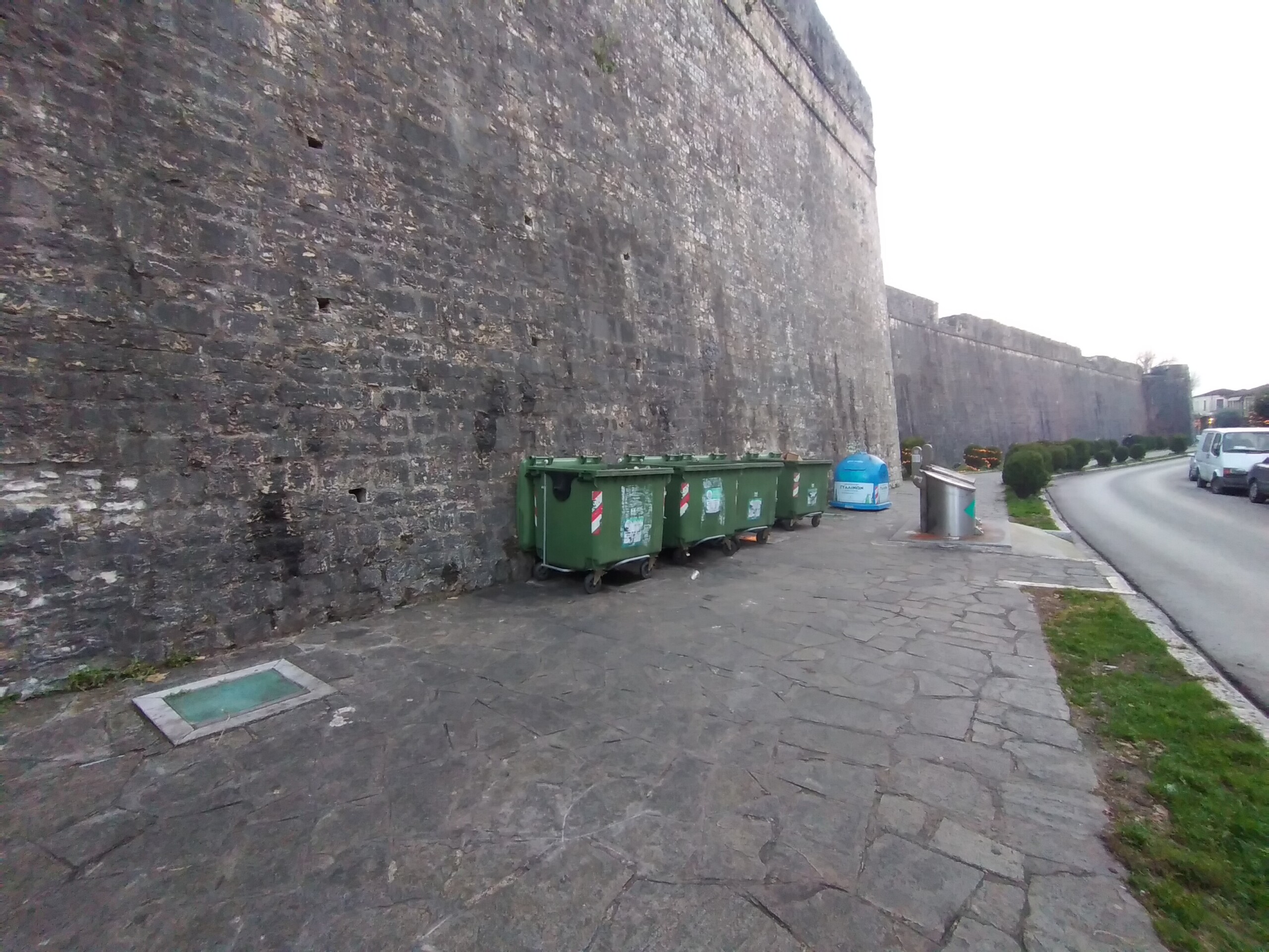 Είναι τουλάχιστον απαράδεκτη η αντιαισθητική εικόνα στα τείχη του Κάστρου στην οδό της Εθνικής Αντιστάσεως με τους πράσινους και μπλε κάδους, για σύμμεικτα και ανακυκλώσιμα απορρίμματα, να καταλαμβάνουν αρκετά μέτρα πεζοδρομίου.
