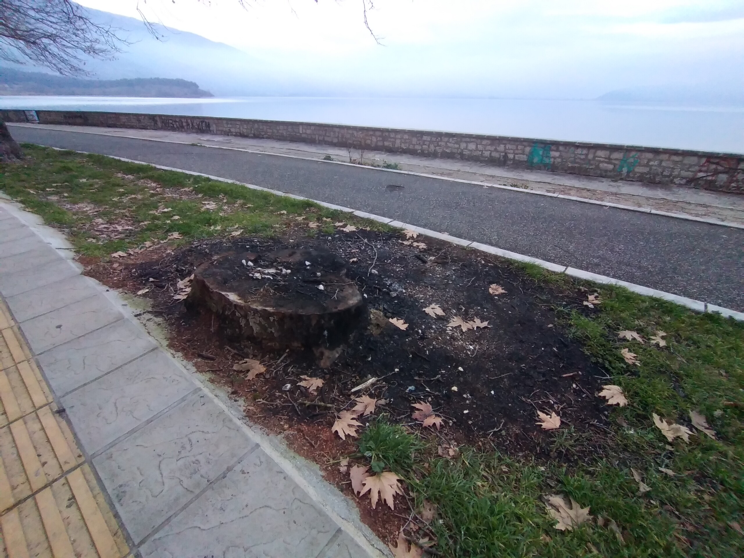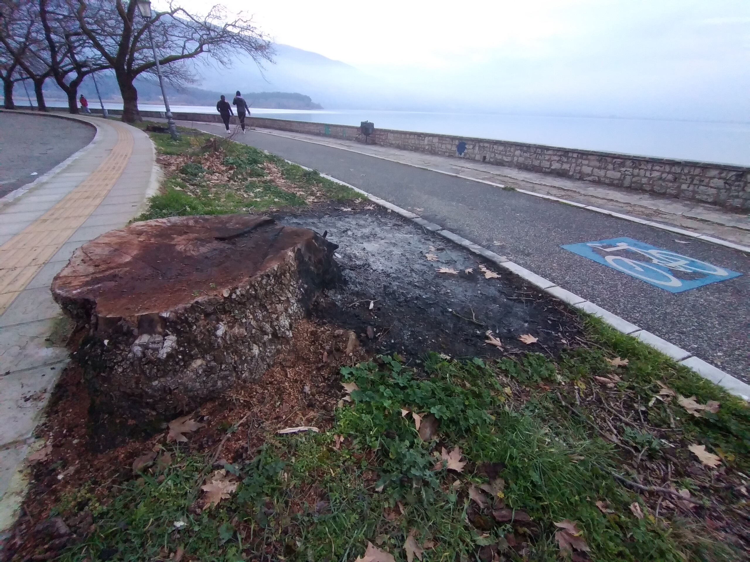 Η δεύτερη εικόνα είναι από την οδό Διον. Φιλοσόφου, στο σημείο κοντά στη Νότια Πύλη του Κάστρου, όπου έχουν κοπεί πολλά πλατάνια. Τα συνεργεία κοπής και απομάκρυνσης των πλατάνων έκαψαν μεν και κάποιες από τις ποσότητες των ξύλων επί τόπου, ωστόσο, όπως φαίνεται και στις φωτογραφίες τα απομεινάρια είναι ακόμη εκεί, με τα κάρβουνα να γίνονται λάσπη από τη βροχή. Πόσο δύσκολο είναι αλήθεια, αφού καθημερινά περνούν από το σημείο, οδοκαθαριστές, να σταλεί και ένα αυτοκίνητο από την υπηρεσία καθαριότητας, να καθαρίσουν τα καμένα και να τα απομακρύνουν;