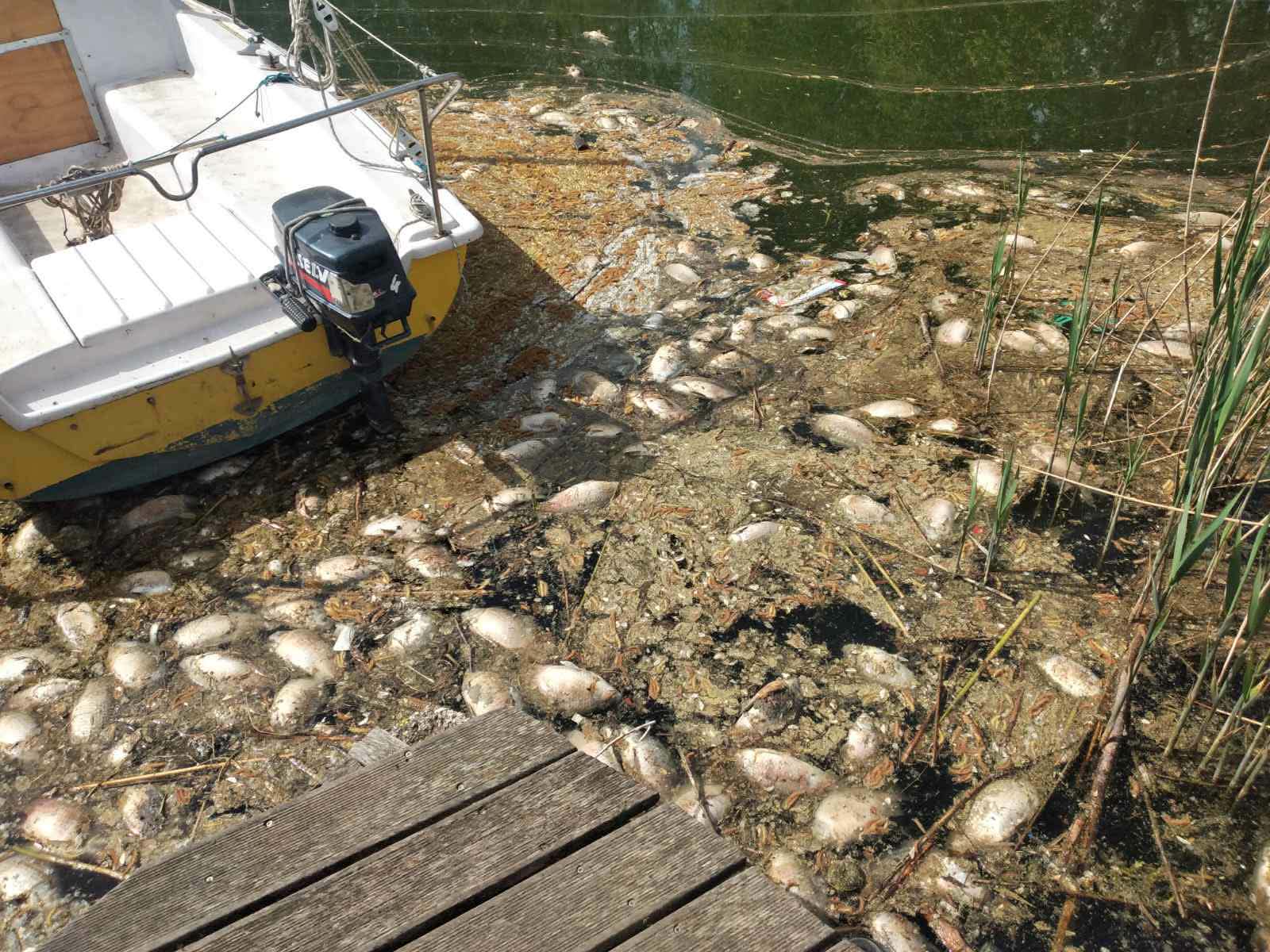 Η κατάσταση, που έκανε την εμφάνισή της την προηγούμενη εβδομάδα, παρουσιάζει πλέον έξαρση, με εκατοντάδες νεκρά ψάρια του είδους «πεταλούδα» να επιπλέουν σε διάφορα σημεία της λίμνης.