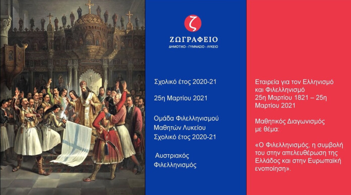 Οι μαθητές του Ζωγράφειου Σχολείου που συμμετέχουν στην Ομάδα Φιλελληνισμού του Λυκείου θα βραβευτούν με έπαινο από την Ε.Ε.Φ. για την εργασία τους με θέμα τον Αυστριακό Φιλελληνισμό. Ως μαθητές του πρώτου Ευρωπαϊκού Σχολείου στην Ήπειρο και του πρώτου Σχολείου στην Ελλάδα που εισάγει στην εκπαιδευτική του διαδικασία στοιχεία Αυστριακής Αγωγής τιμώντας τον Φιλελληνισμό πραγματεύτηκαν τον Αυστριακό Φιλελληνισμό. Στο πλαίσιο αυτό, ερεύνησαν, μελέτησαν και με την ψηφιακή παρουσίαση της εργασίας που δημιούργησαν στο πλαίσιο της φετινής επετείου της 25ης Μαρτίου, παρουσίασαν άγνωστες μέχρι σήμερα πτυχές του Αυστριακού Φιλελληνισμού, που έγραψε τις δικές του χρυσές σελίδες προσφοράς και θυσίας στο πάνθεον των Ηρώων του ’21. Ταυτόχρονα, οι μαθητές του Ζωγράφειου Σχολείου κατέγραψαν και ανέδειξαν τον Αυστριακό Φιλελληνισμό, ως μια δυναμική στήριξης της πατρίδας μας ακόμη και σήμερα, καθώς δεν είναι απλά ένα στατικό ιστορικό γεγονός που συνέβη πριν από 200 χρόνια αλλά αποτελεί ένα διαρκές και διαχρονικό δυναμικό κίνημα προσφοράς προς τη χώρα μας.