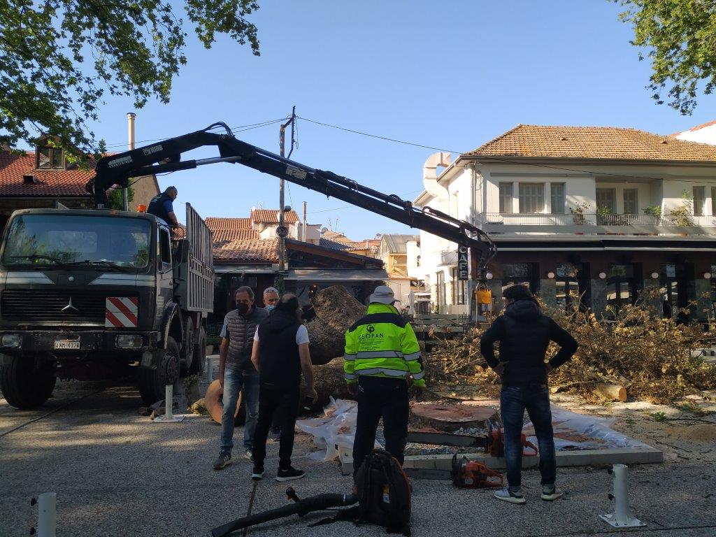 Έτσι, χρειάστηκε από τα ξημερώματα να απομακρύνουν τα τραπεζοκαθίσματα και τις ομπρέλες για να δοθεί χώρος στο συνεργείο ώστε να κάνει τις εργασίες, οι οποίες ολοκληρώθηκαν πριν από λίγη ώρα.