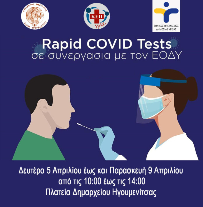 Δευτέρα 5 Απριλίου έως και Παρασκευή 9 Απριλίου, από τις 10:00 έως τις 14:00, το κλιμάκιο του ΕΟΔΥ θα βρίσκεται στην πλατεία Δημαρχείου, στην Ηγουμενίτσα και θα πραγματοποιεί δωρεάν ελέγχους ταχείας ανίχνευσης αντιγόνου (rapid test) Covid-19 σε πεζούς, στο πλαίσιο των μέτρων πρόληψης και προστασίας της υγείας του πληθυσμού από το νέο κορωνοϊό.