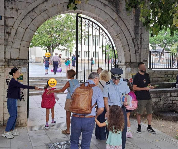 Αστυνομικοί βρέθηκαν σήμερα το πρωί σε δημοτικά σχολεία κατά την προσέλευση μαθητών και γονέων για την καθιερωμένη τελετή του Αγιασμού, όπου μοίρασαν ευχές, αλλά και φυλλάδια και σχολικά προγράμματα με συμβουλές οδικής ασφάλειας.