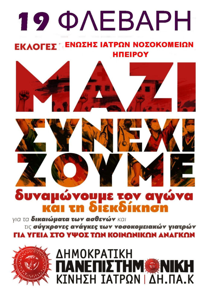 Σε αγωνιστικό τόνο απευθύνεται προς τους νοσοκομειακούς γιατρούς η ΔΗΠΑΚ Ιατρών Ηπείρου – Λευκάδας ενόψει των εκλογών της ΕΙΝΗ την Πέμπτη 19 Φεβρουαρίου, καλώντας σε μαζική συμμετοχή και ενίσχυση των ψηφοδελτίων της.