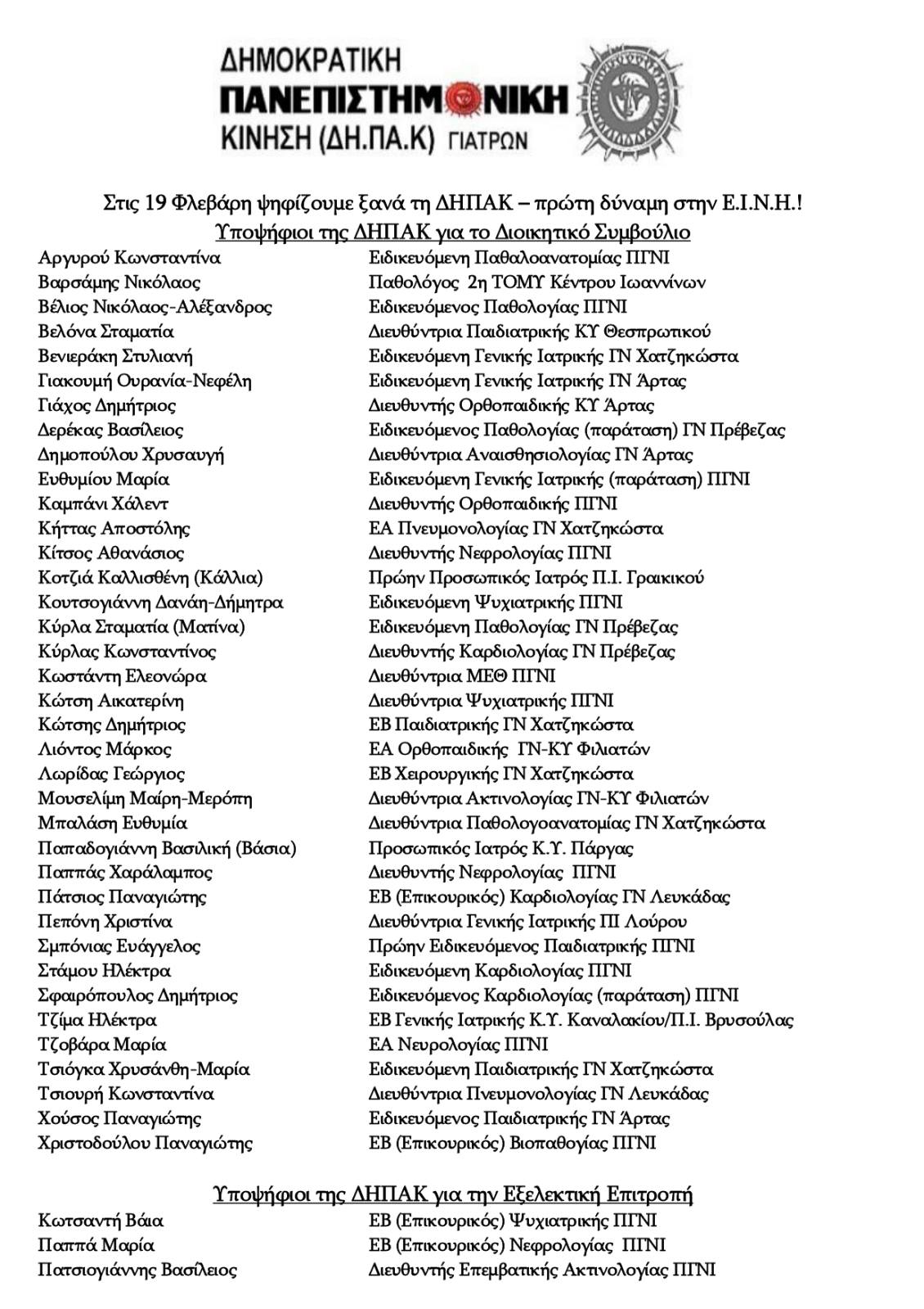 Το ψηφοδέλτιο της ΔΗΠΑΚ Ιατρών Ηπείρου – Λευκάδας
