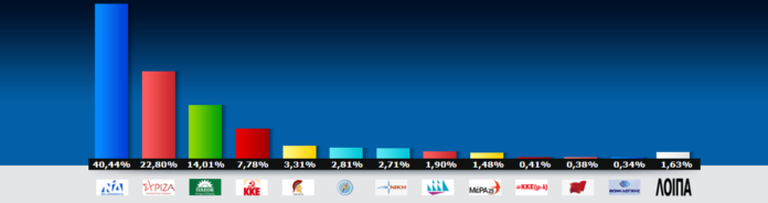 Με καταμετρημένες τις ψήφους σε 1.063 εκλογικά τμήματα, η ΝΔ συγκεντρώνει το 39,61%, ο ΣΥΡΙΖΑ το 23,11% το ΠΑΣΟΚ συγκεντρώνει το 13,43%, το ΚΚΕ 7,60% ενώ στην πέμπτη θέση βρίσκονται οι Σπαρτιάτες με 3,63%.