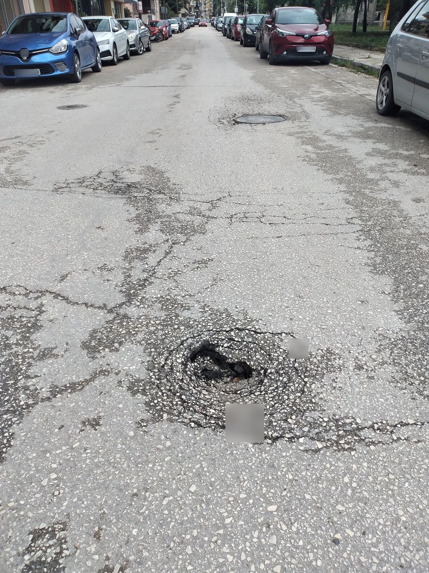 Το υπόστρωμα έχει υποχωρήσει για άγνωστο λόγο και καθημερινά η λακκούβα αποκτά μεγαλύτερο βάθος καθώς ο δρόμος παρουσιάζει μεγάλη κίνηση και Ι.Χ αλλά και βαρέων οχημάτων, που κινούνται συνεχώς λόγω των εργασιών στο διπλανό οίκημα του Γηροκομείου.