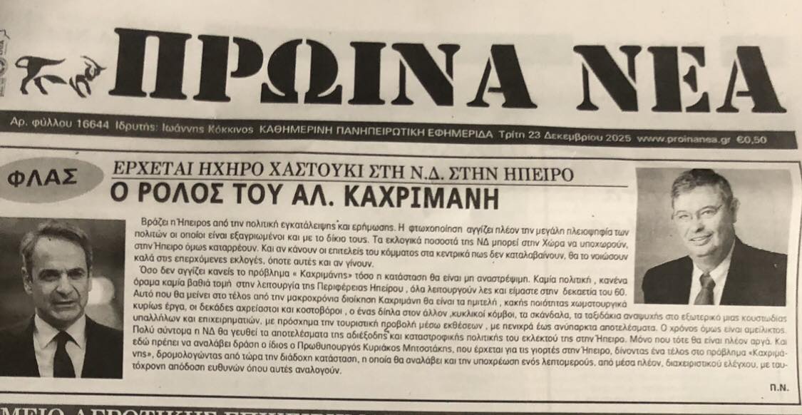 Την παρέμβαση Μητσοτάκη για να λυθούν τα τεράστια προβλήματα που έχουν δημιουργηθεί στην Ηπειρο από τη διοίκηση του Περιφερειάρχη Αλ. Καχριμάνη, ζητά με πρωτοσέλιδο άρθρο της, η ιστορική και καθημερινή εφημερίδα «Πρωϊνά Νέα».