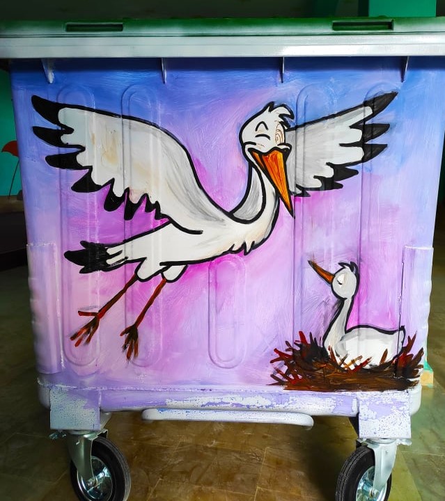 Στο δημιουργικό αποτύπωμα ο πατέρας πελαργός απεικονίζεται να συλλέγει τα σκουπίδια και να τα εναποθέτει στον κάδο, δίνοντας το παράδειγμα στο παιδί του, ώστε να μπορεί η οικογένεια του να μεγαλώσει σ’ ένα περιβάλλον καθαρό.