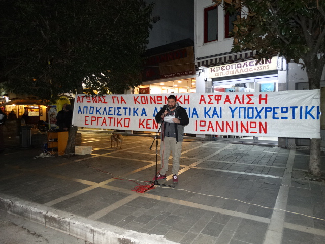 Στη συγκέντρωση μίλησε ο Δημήτρης Καλύβας, πρόεδρος του Σωματείου Γάλατος-Τροφίμων-Ποτών Ιωαννίνων, ο οποίος μεταξύ άλλων, κάλεσε σε απεργία στις 18 Φεβρουαρίου λέγοντας ότι «οι μεγάλοι αγώνες που αναπτύχθηκαν τα προηγούμενα χρόνια έπαιξαν σημαντικό ρόλο στην υπεράσπιση του κοινωνικού χαρακτήρα της Ασφάλισης, έβαλαν εμπόδια στην ολοκλήρωση των αντιασφαλιστικών ανατροπών».