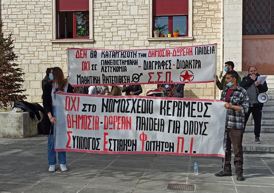 Οι φοιτητές ζητούν να μην εφαρμοστεί ο νόμος Κεραμέως – Χρυσοχοΐδη για την αστυνόμευση στα ΑΕΙ. «Να ανοίξουν τώρα οι σχολές μας, ο δίκαιος αγώνας μας για να μην εφαρμοστεί και να ανατραπεί ο νόμος Κεραμέως – Χρυροχοΐδη συνεχίζεται», αναφέρουν οι διαδηλωτές στην ανακοίνωσή τους.