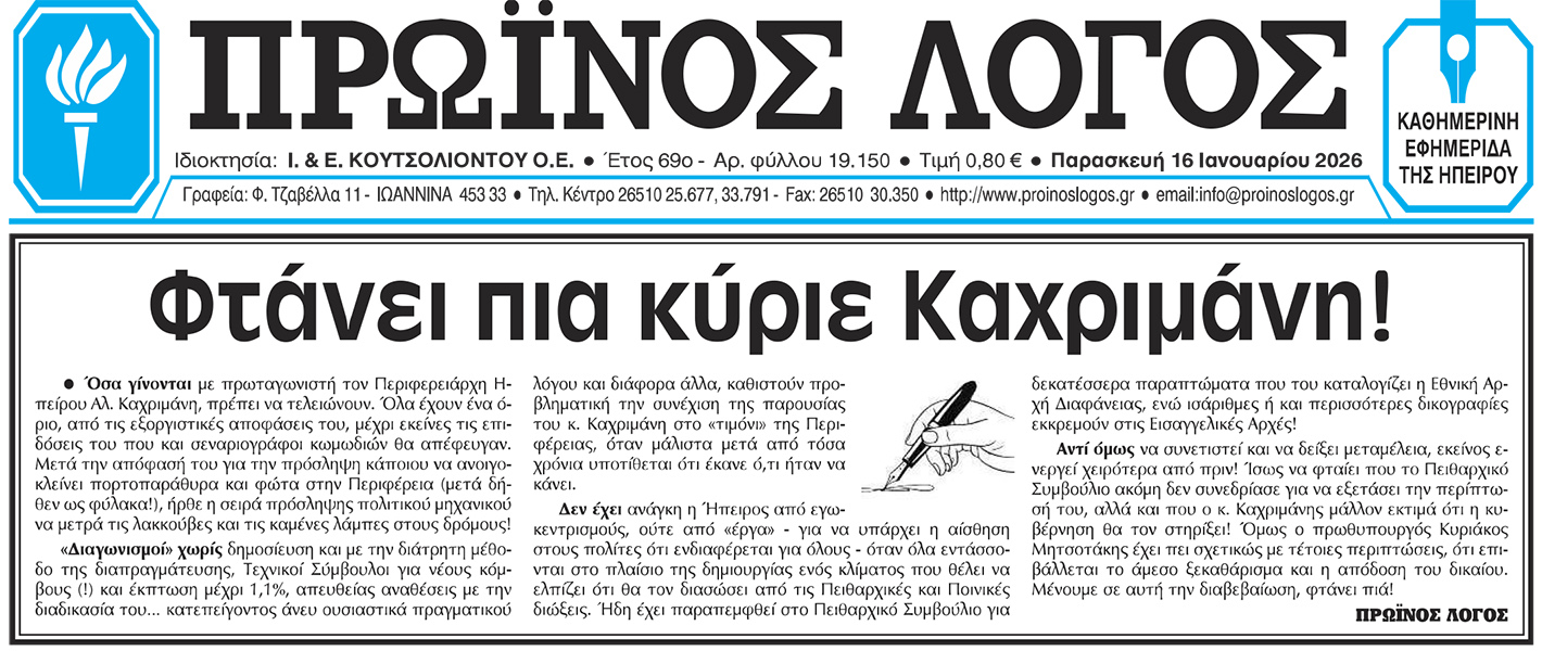 Από το πρωτοσέλιδο του “Πρωϊνού Λόγου” στις 16-1-2026