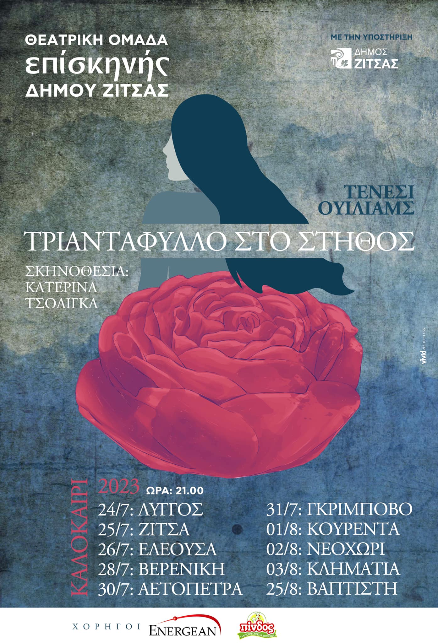 Η θεατρική ομάδα «Επί Σκηνής» ανεβάζει φέτος το «Τριαντάφυλλο στο Στήθος» του Τενεσί Ουίλιαμς σε σκηνοθεσία Κατερίνας Τσολίγκα και ήδη έχει ξεκινήσει τις παραστάσεις της σε χωριά του Δήμου Ζίτσας, ενώ έχει προγραμματίσει παραστάσεις στον Δήμο Βόρειο Τζουμέρκων αλλά και στην Δερβίτσανη στην Αλβανία.