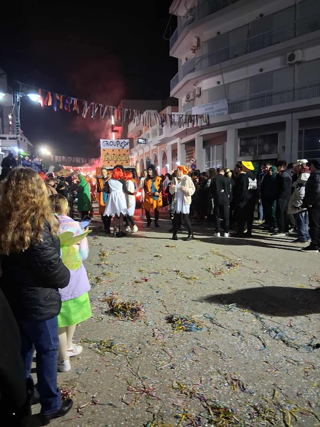 Η συμμετοχή ήταν έντονη και η ατμόσφαιρα ζεστή: χειροκρότημα, χαμόγελα, φωτογραφίες και αρκετή ενέργεια σε όλη τη διαδρομή. Στο “κομμάτι” των συμμετοχών, η επίσημη σειρά που είχε δημοσιευτεί περιλάμβανε 38 γκρουπ, ενώ στο ίδιο πλαίσιο υπήρχε και χώρος για αυτοσχέδιες ομάδες/ελεύθερη συμμετοχή, μαζί με τον καρνάβαλο και τη βασίλισσα της διοργάνωσης. Στολές, μουσική, χορός και πειράγματα έδωσαν τον ρυθμό, με τη σάτιρα να περνάει σταθερά μέσα από τα θέματα και τις εμφανίσεις των ομάδων.