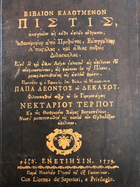 - Το «βιβλίον καλούμενον ΠΙΣΤΙΣ» του Μοσχοπολίτη Νεκταρίου Τέρπου, στην επανέκδοση του 1779 που έγινε από τον Νικόλαο Γλυκή τον εξ Ιωαννίνων. Το βιβλίο εκδόθηκε αρχικά το 1732 στη Βενετία και επανεκδόθηκε πολλές φορές.