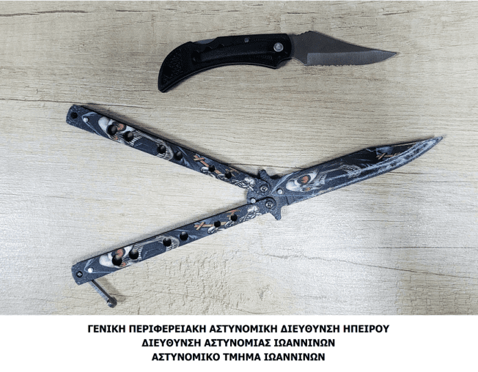 Ειδικότερα, στο πλαίσιο των προβλεπόμενων ελέγχων που πραγματοποιούνται κατά την είσοδο ατόμων στο Δικαστικό Μέγαρο Ιωαννίνων, βρέθηκαν στην κατοχή του κατηγορούμενου και κατασχέθηκαν στιλέτο τύπου «πεταλούδας», συνολικού μήκους 22 εκατοστών και αναδιπλούμενος σουγιάς, συνολικού μήκους 13 εκατοστών.