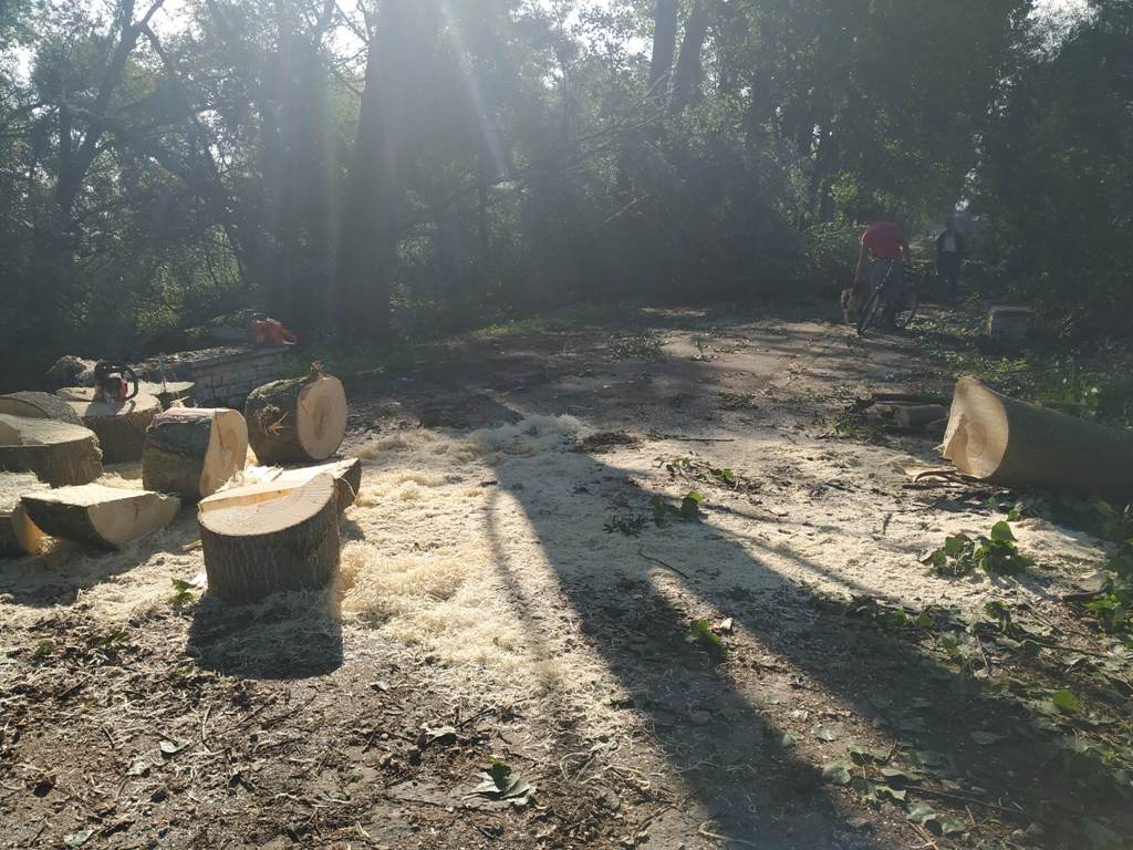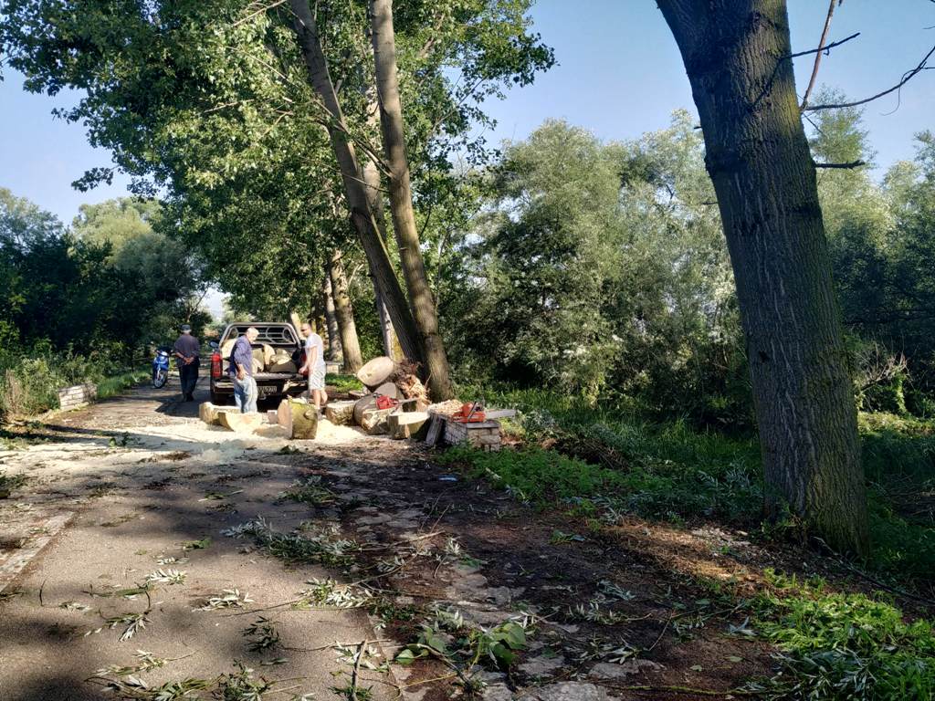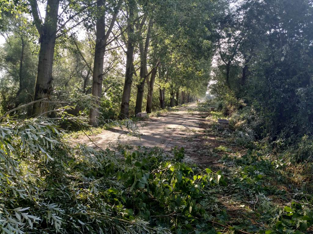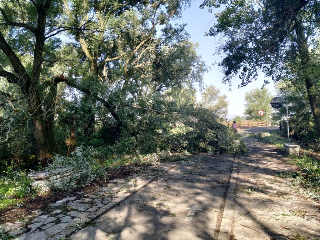 Η ξαφνική νεροποντή που συνοδευόταν από δυνατούς ανέμους είχε ως αποτέλεσμα την πτώση τεράστιων κορμών από λεύκες στον πεζόδρομο ενώ σε όλο το μήκος του το οδόστρωμα έχει καταληφθεί από κλαδιά που έπεσαν επίσης την ίδια ώρα.