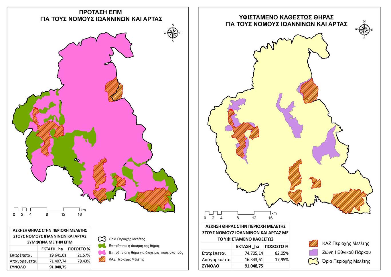 Επί της ουσίας, το κυνήγι σε ελάχιστες περιοχές των νομών Ιωαννίνων και Άρτας από το όρος Περιστέρι και προς τα νότια, με τις αντιδράσεις να είναι έντονες και για την ουσία των προτάσεων και για τα επιχειρήματα που χρησιμοποιούνται, για να αιτιολογήσουν τις απαγορεύσεις αυτές. Χρησιμοποιείται μάλιστα όπως επισημαίνουν οι κυνηγετικές οργανώσεις ένας εύσχημος τρόπος ώστε να μην υπάρχει πουθενά στη μελέτη η λέξη «απαγόρευση» για την άσκηση θήρας, αλλά καθορίζονται τεράστιες περιοχές ως Ζώνες Προστασίας της Φύσης και ως Ζώνες Διατήρησης Οικοτόπων και Ειδών στις οποίες όμως η θήρα δεν επιτρέπεται παρά μόνον εάν προκύψει διαχειριστική ανάγκη. Αν δηλαδή σε μία περιοχή υπάρχει πρόβλημα με την αύξηση του αριθμού των αγριόχοιρων και μεγάλες ζημιές σε καλλιέργειες, κατόπιν σχετικού αιτήματος μπορεί να συνταχθεί μία διαχειριστική μελέτη ώστε να ζητηθεί από τις κυνηγετικές οργανώσεις να ασκήσουν θήρα, για συγκεκριμένο αριθμό ατόμων του είδους και για περιορισμένη χρονική περίοδο.