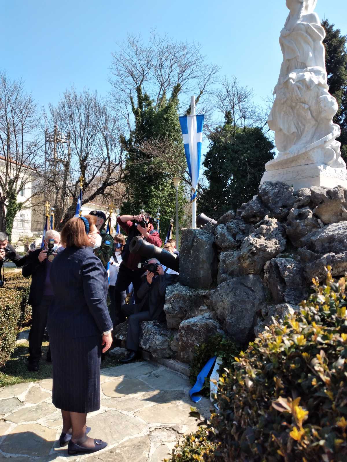 Την κυβέρνηση εκπροσώπησε στις επετειακές εκδηλώσεις η υπουργός Πολιτισμού Λίνα Μενδώνη, που αναφέρθηκε στο μήνυμα της επικαιροποίησης των πανανθρώπινων αξιών της ελευθερίας και της ανεξαρτησίας απέναντι στον αυταρχικό δεσποτισμό, μιλώντας για τον πόλεμο στην Ουκρανία.