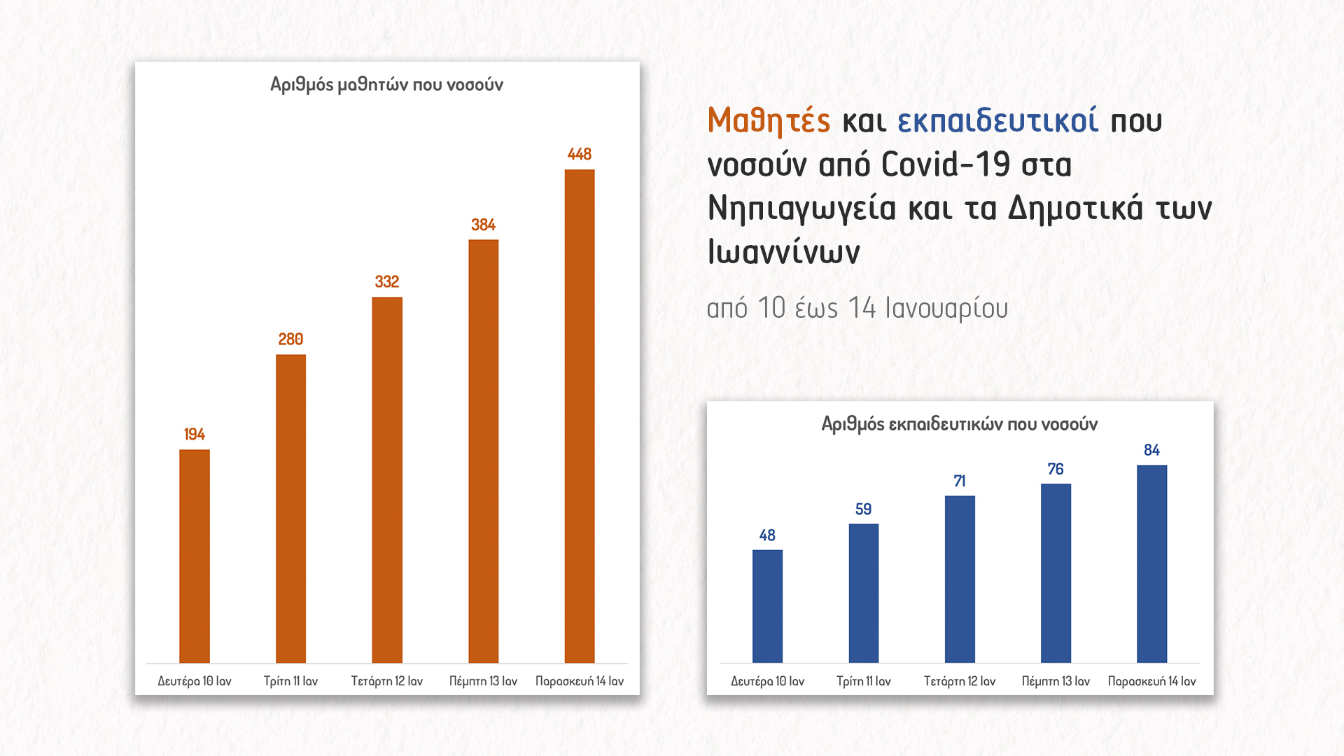 «Εκατοντάδες ήταν τα κρούσματα σε μαθητές και εκπαιδευτικούς των Νηπιαγωγείων και των Δημοτικών στα Ιωάννινα, την πρώτη εβδομάδα επαναλειτουργίας των σχολείων. Κυβέρνηση και υπουργείο Παιδείας εφαρμόζουν το σχέδιο «ανοσία της αγέλης στα θρανία», αδιαφορώντας για τον υγειονομικό αντίκτυπο τόσο στα σχολεία, όσο και στην ευρύτερη κοινότητα.