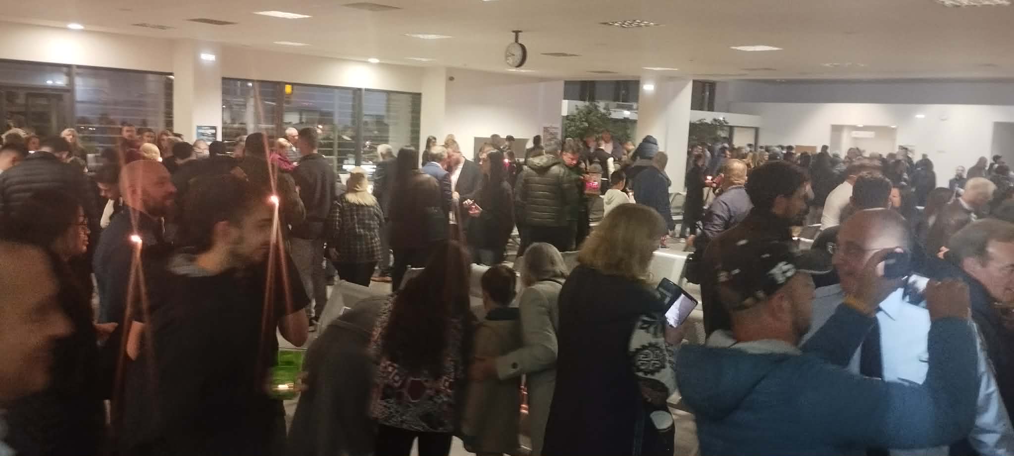 Εκατοντάδες πιστοί περίμεναν υπομονετικά στην αίθουσα αναμονής κρατώντας λαμπάδες, κεριά και φαναράκια στα χέρια τους, για να πάρουν το Άγιο Φως και μαζί με τους ιερείς της Μητρόπολης Ιωαννίνων να το μεταφέρουν στις Ενορίες της πόλης και των χωριών.