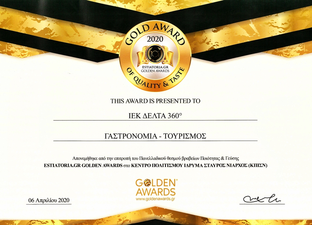 Το “Gold Award of Quality & Taste 2020” του Πανελλαδικού θεσμού βραβείων Ποιότητας & Γεύσης των Estiatoria.gr Golden Awards αποδεικνύει περίτρανα την επικράτηση του ΙΕΚ ΔΕΛΤΑ 360 ως η σχολή με την κορυφαία ποιότητα εκπαιδευτικών υπηρεσιών.