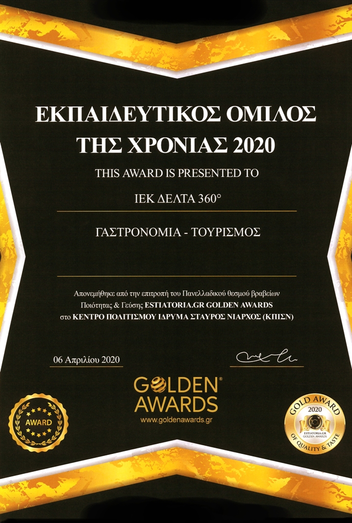 Το “Gold Award of Quality & Taste 2020” του Πανελλαδικού θεσμού βραβείων Ποιότητας & Γεύσης των Estiatoria.gr Golden Awards αποδεικνύει περίτρανα την επικράτηση του ΙΕΚ ΔΕΛΤΑ 360 ως η σχολή με την κορυφαία ποιότητα εκπαιδευτικών υπηρεσιών.