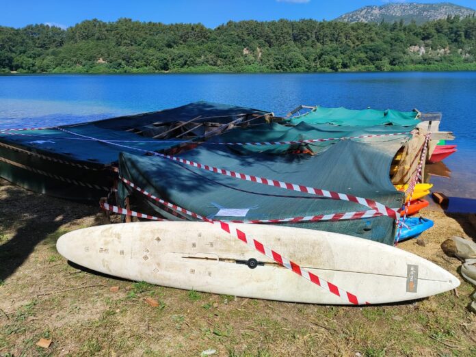 Πιο αναλυτικά, κατά την αυτοψία του μεικτού ελεγκτικού κλιμακίου διαπιστώθηκε η ύπαρξη αυθαίρετων καταλήψεων τριών τμημάτων εντός των υδάτων και της όχθης της λίμνης με πρόχειρες ξύλινες κατασκευές (προβλήτα κ.ά.) συνολικού εμβαδού 120 τετραγωνικών μέτρων για χρήση κανό-καγιάκ.