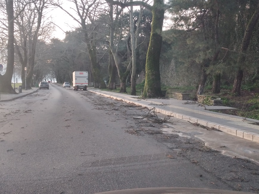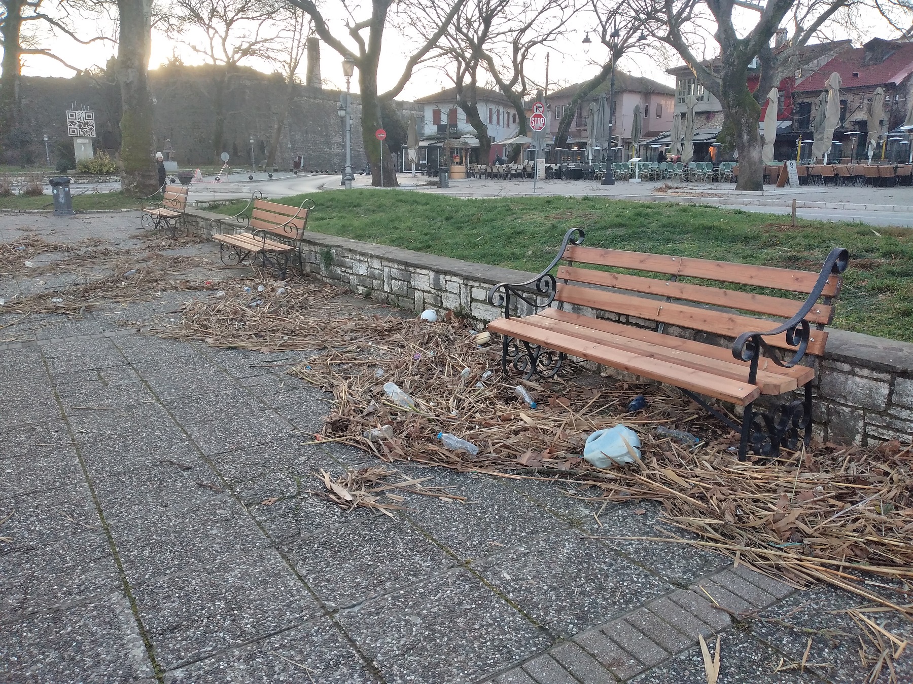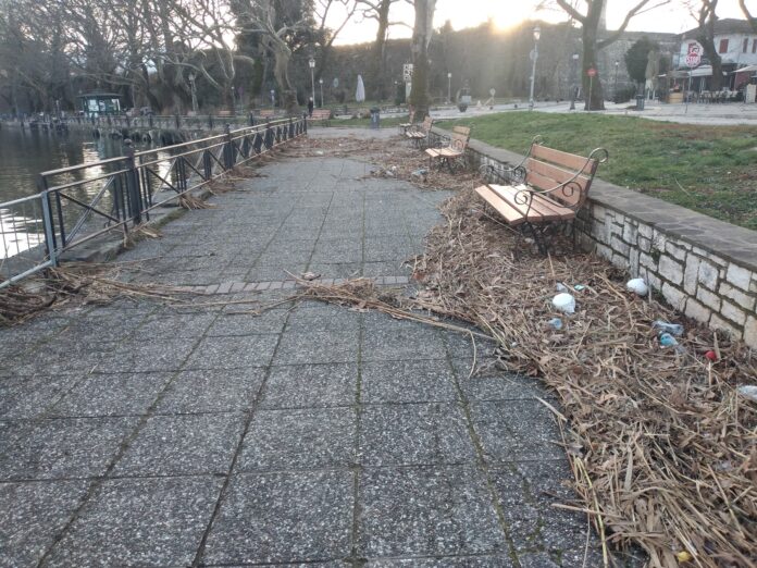 Οι άνεμοι κόπασαν το βράδυ και η εικόνα στο παραλίμνιο μέτωπο έφερε στο προσκήνιο εκατοντάδες σπασμένα κλαδιά κατά μήκος της Διονυσίου Φιλοσόφου αλλά και στα πεζοδρόμια, μαζί με καλάμια, αλλά και απορρίμματα που παρασύρθηκαν από τον αέρα.