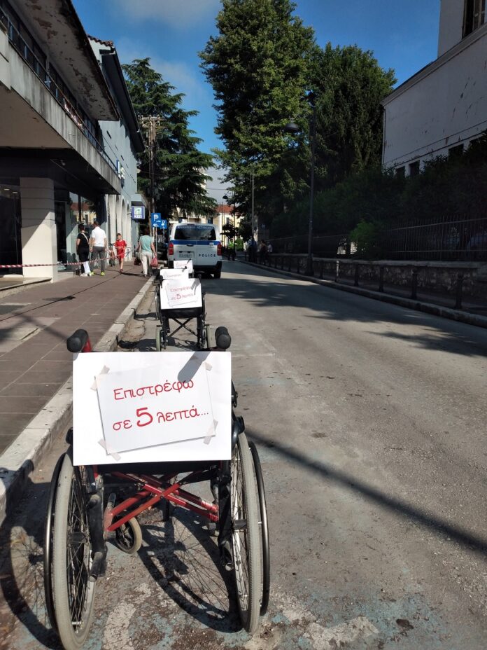 Στα αμαξίδια είχαν τοποθετηθεί πλακάτ με την αναγραφή «Επιστρέφω σε 5’» μία επιγραφή που βρίσκουν πολλές φορές σε Ι.Χ που σταθμεύουν παράνομα σε θέσεις για ΑμεΑ.