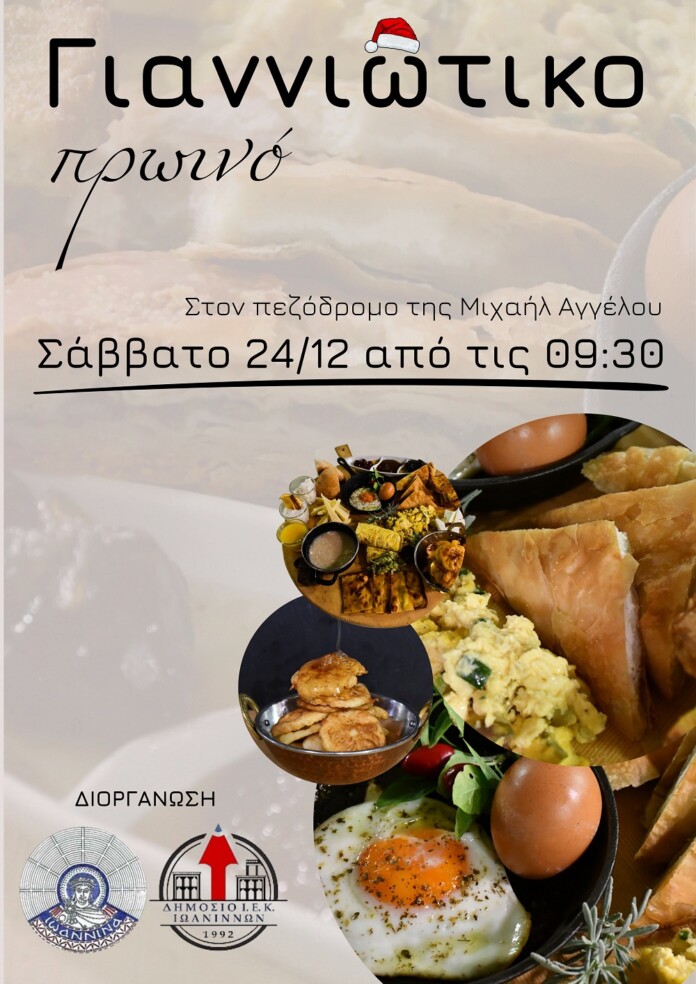 Το Σάββατο 24 Δεκεμβρίου, από τις 9:30 το πρωί, στην διασταύρωση των πεζοδρόμων Μιχαήλ Αγγέλου και Γρηγορίου Σακκά, θα προσφέρουν εδέσματα και θα παρουσιάζουν συνταγές με βάση το παραδοσιακό γιαννιώτικο πρωινό.