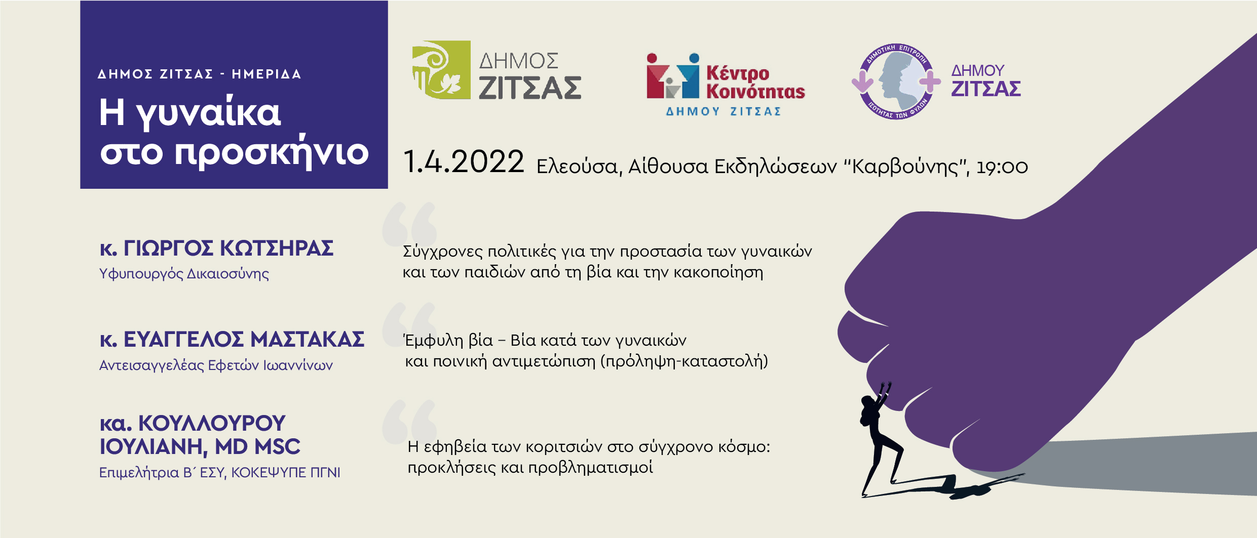 Με ομιλητή τον υφυπουργό Δικαιοσύνης Γιώργος Κώτσηρα θα πραγματοποιηθεί ημερίδα με τίτλο «Η γυναίκα στο προσκήνιο», την οποία συνδιοργανώνουν ο Δήμος Ζίτσας, το Κέντρο Κοινότητας και η Δημοτική Επιτροπή Ισότητας των Φύλων του Δήμου Ζίτσας, την Παρασκευή 1 Απριλίου, στην Ελεούσα.