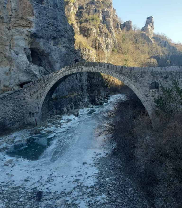 Στην περιοχή του Ζαγορίου, το Μπαγιώτικο ρέμα στη γέφυρα Κοκκόρου πάγωσε, όπως αποτυπώνεται στις εντυπωσιακές εικόνες.