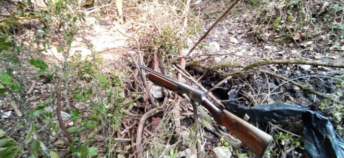 Οι φόβοι τους επιβεβαιώθηκαν, καθώς σε μικρή απόσταση από τις συρμάτινες θηλιές, εντοπίστηκε ένα κυνηγετικό όπλο, καλυμμένο από κλαδιά και μία πλαστική σακούλα απορριμμάτων, με τη σκανδάλη του να είναι δεμένη με πετονιά και συνδεδεμένη με τις θηλιές, ώστε το όπλο να είναι σε φάση εκπυρσοκρότησης.