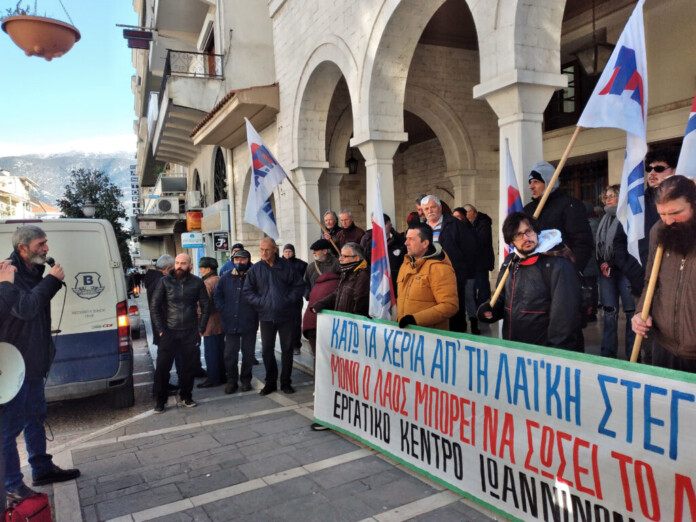 Στέλνοντας το μήνυμα ότι δεν πρόκειται να αφήσουν καμία παρόμοια περίπτωση να οδηγηθεί στον πλειστηριασμό σπιτιού από καμία λαϊκή οικογένεια, το Εργατικό Κέντρο Ιωαννίνων πραγματοποίησε χθες συμβολική παράσταση διαμαρτυρίας μπροστά από κεντρικό υποκατάστημα τράπεζας, απαιτώντας την άμεση διακοπή της διαδικασίας πλειστηριασμού μίας κατοικίας, που ανήκει σε χαμηλοσυνταξιούχους στην Ανατολή.