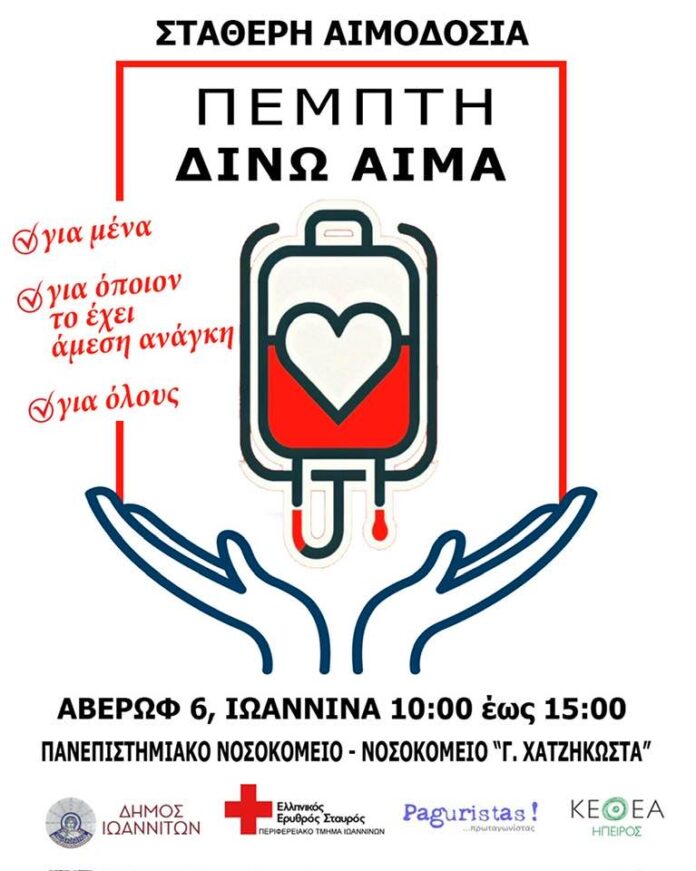 Τις αιμοδοσίες οργανώνουν ο Ελληνικός Ερυθρός Σταυρός Ιωαννίνων, η ανοιχτή εθελοντική ομάδα των Paguristas και το ΚΕΘΕΑ Ήπειρος, με τη συνδρομή του ιατρικού και νοσηλευτικού προσωπικού του Πανεπιστημιακού Γενικού Νοσοκομείου Ιωαννίνων και του Γενικού Νοσοκομείου «Γ. Χατζηκώστα», από τις 10 το πρωί μέχρι τις 3 το μεσημέρι.