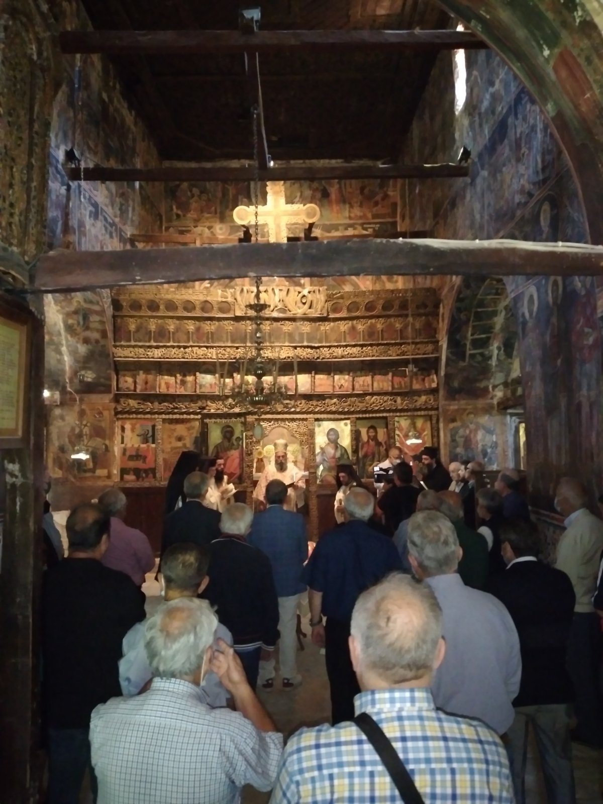 Το αντάμωμα άρχισε με Θεία Λειτουργία και Αρτοκλασία, στον ανακαινισμένο Ιερό Ναό της Μονής, μετά την αποκατάσταση των ζημιών από το σεισμό. Ακολούθησε επιμνημόσυνη δέηση για τους εκλιπόντες καθηγητές και σπουδαστές.