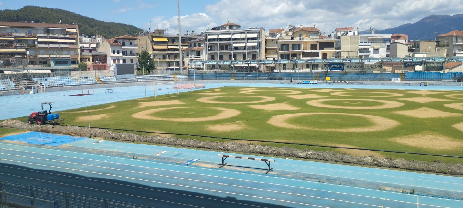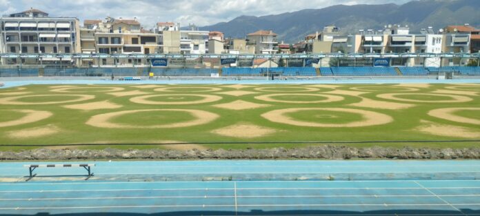 Δεν είναι τα γεωγλυφικά της πεδιάδας Νάζκα στο Περού, αλλά θα μπορούσε λόγω του ομοιόμορφου σχήματος που έχουν τα σχήματα που δημιουργήθηκαν λόγω της κακής συντήρησης. Η ευθύνη για αυτήν ανήκει στην ΠΑΕ ΠΑΣ ΓΙΑΝΝΙΝΑ με τη διοίκηση Χριστοβασίλη βέβαια να έχει εγκαταλείψει τα πάντα εδώ και μήνες και από την εγκατάλειψη δε θα μπορούσε να απουσιάζει και η συντήρηση του χλοοτάπητα και η αποκατάσταση μίας βλάβης στο σύστημα ποτίσματος.