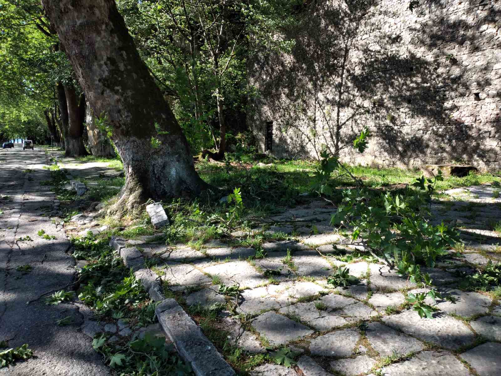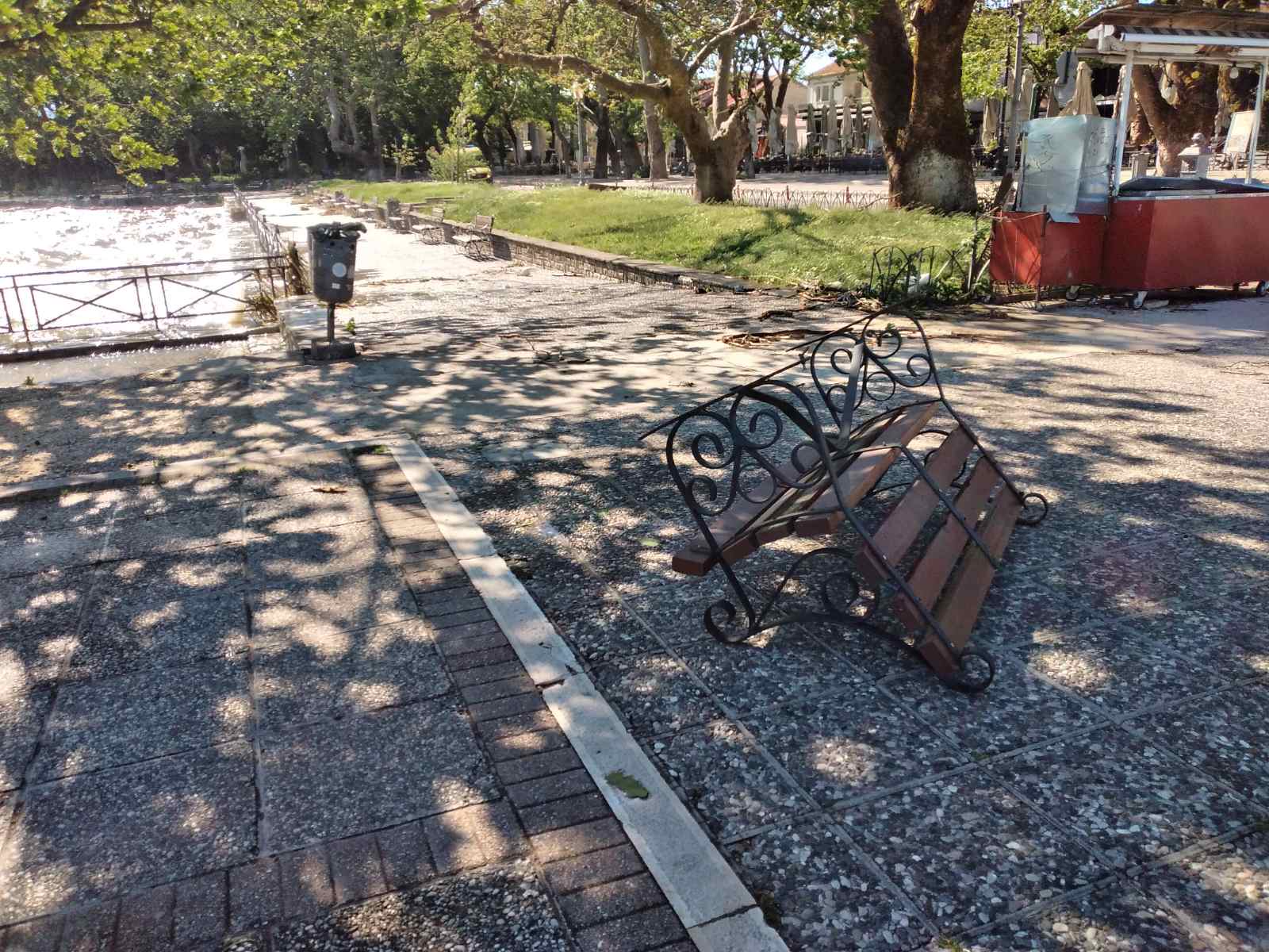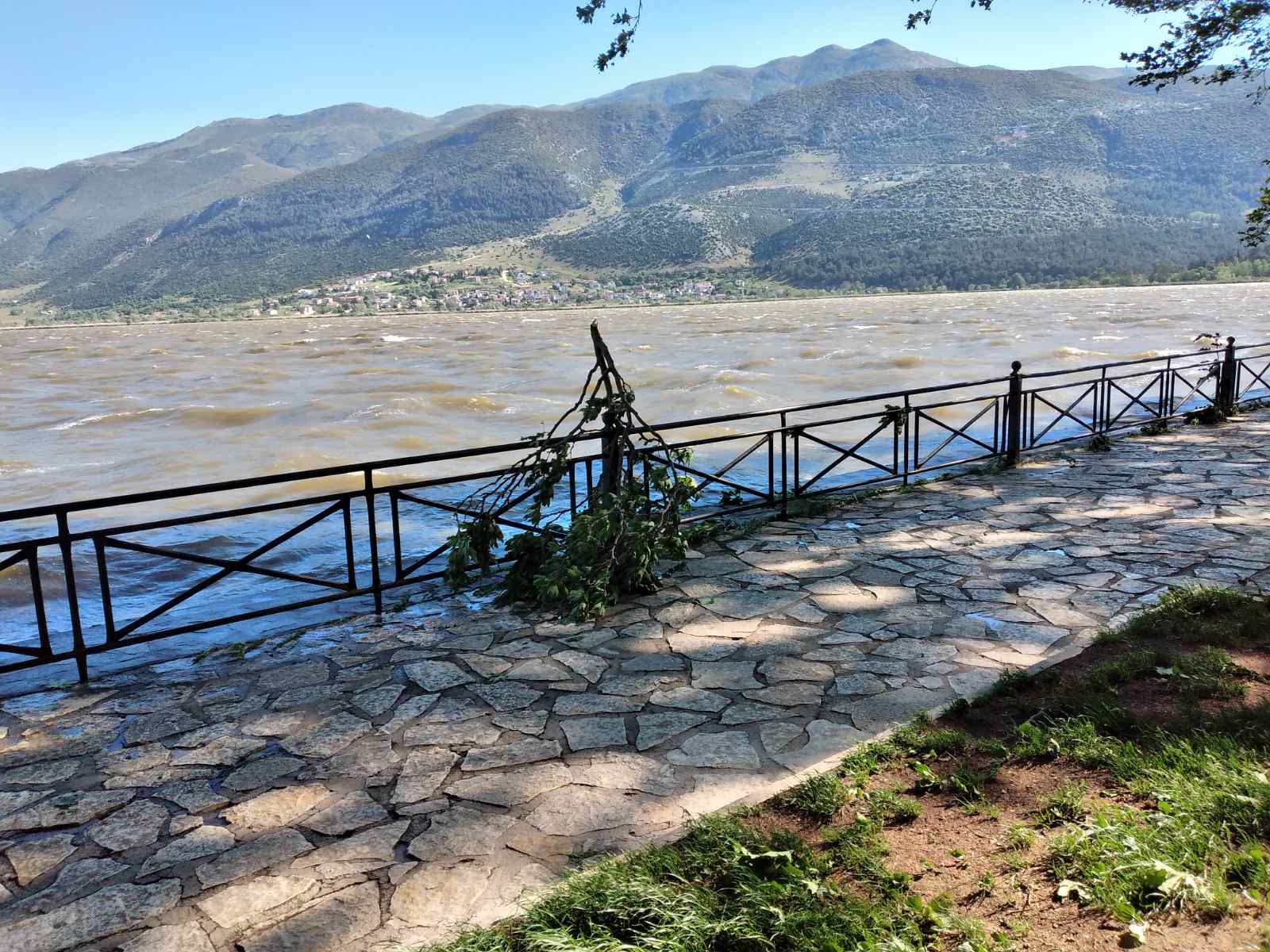 Λυγισμένοι κορμοί, σπασμένα κλαδιά και ξηλωμένα σιδερένια παγκάκια(!) κατά μήκος της παραλίμνιας διαδρομής είναι η εικόνα που αποκαλύφθηκε το πρωί ως αποτέλεσμα των θυελλωδών ανέμων που πνέουν από το βράδυ της Τετάρτης μέχρι και το μεσημέρι της Πέμπτης στο λεκανοπέδιο.