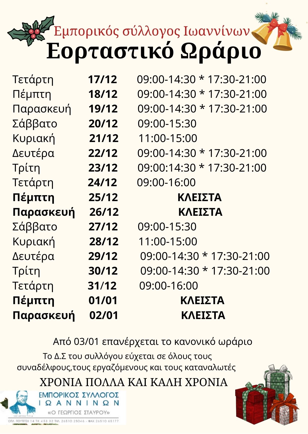 Το εορταστικό ωράριο λειτουργίας των εμπορικών καταστημάτων στα Ιωάννινα ανακοίνωσε ο Εμπορικός Σύλλογος Ιωαννίνων, ενόψει των Χριστουγέννων και της Πρωτοχρονιάς, δίνοντας τη δυνατότητα στους καταναλωτές να πραγματοποιήσουν τις αγορές τους με διευρυμένο ωράριο.