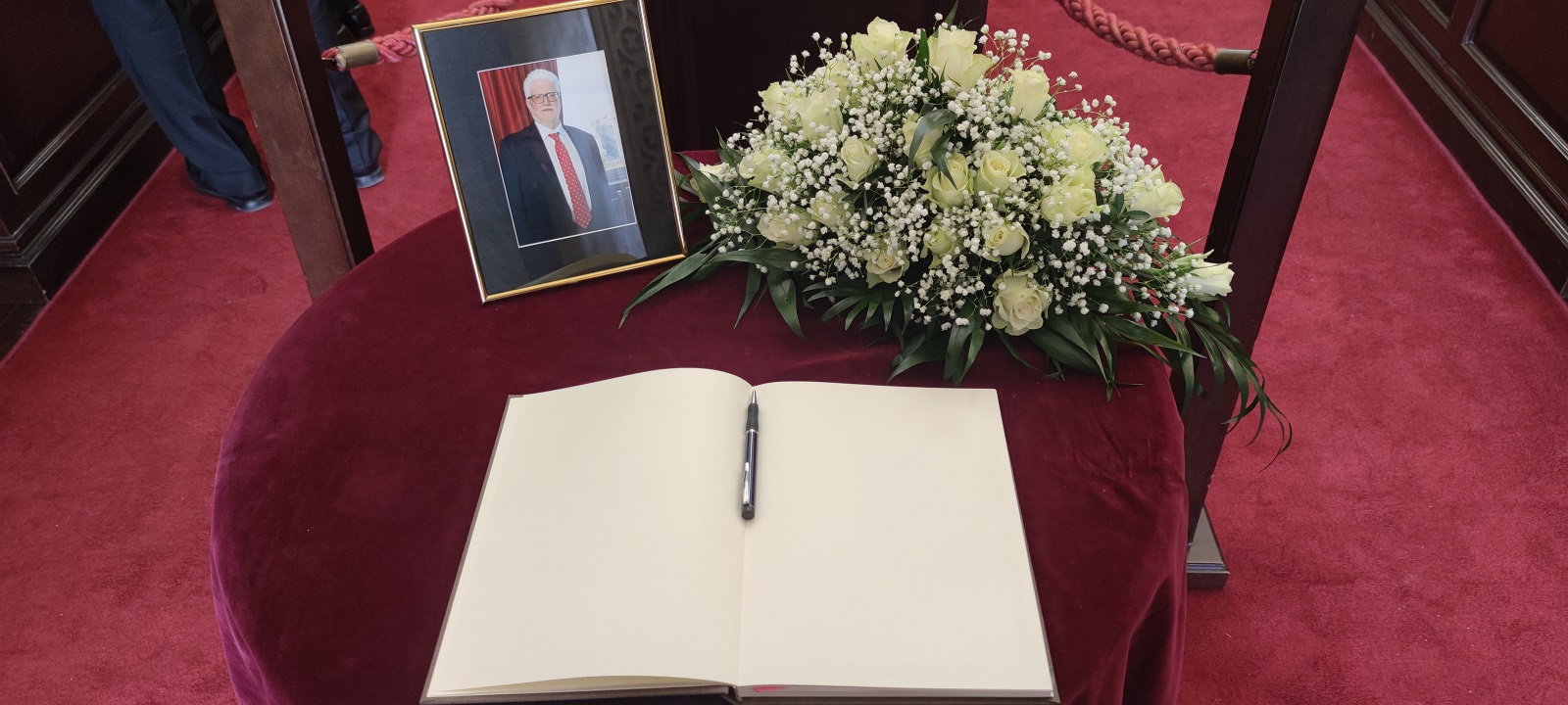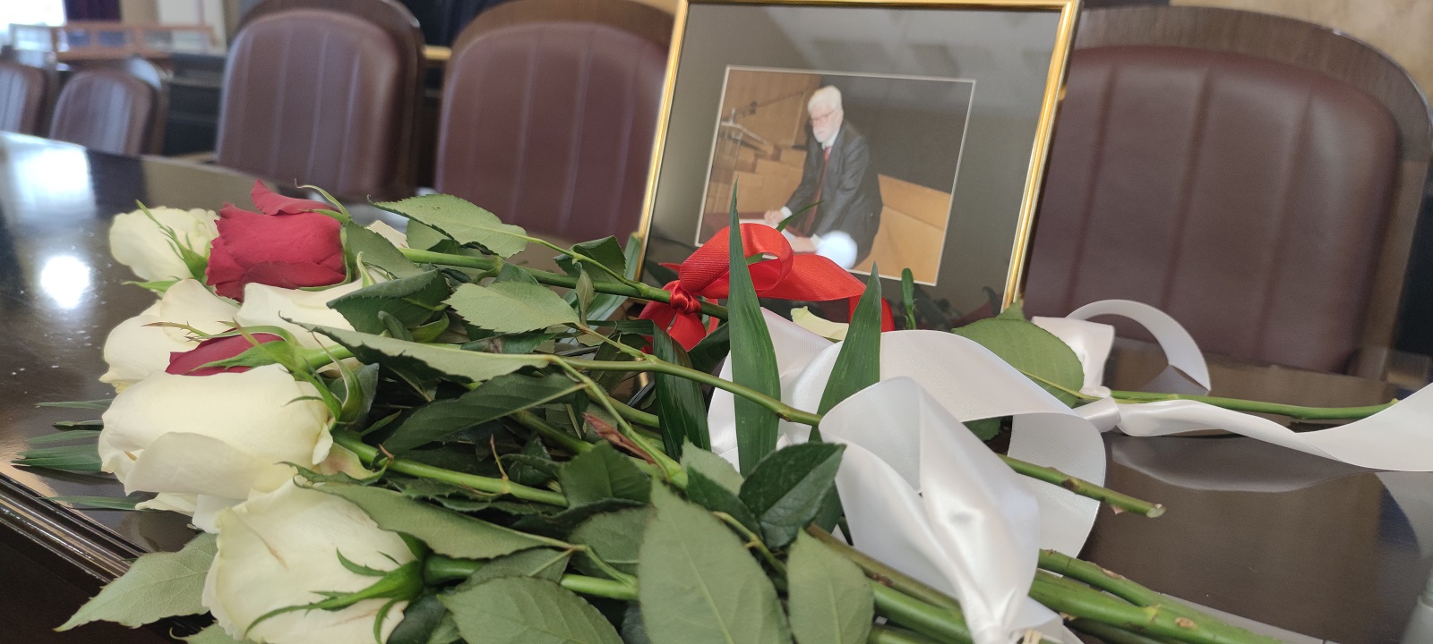 Το έδρανο του δημάρχου στην αίθουσα συνεδριάσεων γέμισε με λευκά τριαντάφυλλα που εναπόθεσαν δημοτικοί σύμβουλοι και συνεργάτες του.