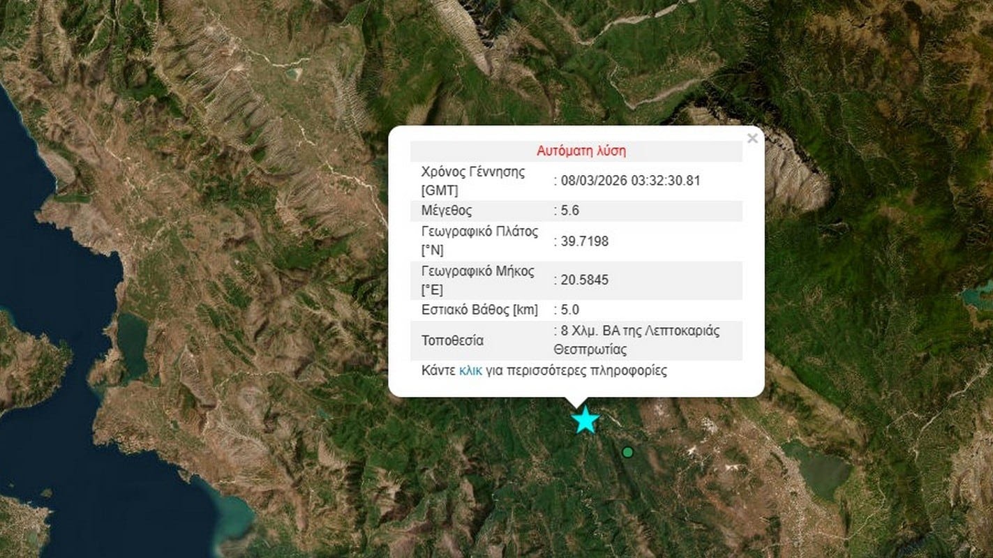 Ισχυρή σεισμική δόνηση μεγέθους 5,6 βαθμών της κλίμακας Ρίχτερ σημειώθηκε τα ξημερώματα της Κυριακής στη Θεσπρωτία.