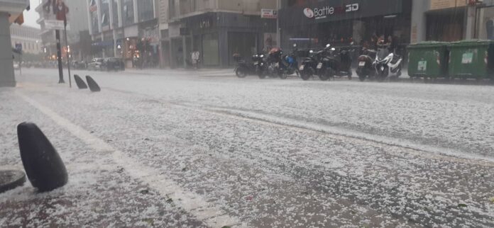 Το χαλάζι έχει μέγεθος φουντουκιού, με αποτέλεσμα οι δρόμοι και τα πεζοδρόμια να δείχνουν χιονισμένα. Η κυκλοφορία των αυτοκινήτων στο κέντρο της πόλης γίνεται με δυσκολία.