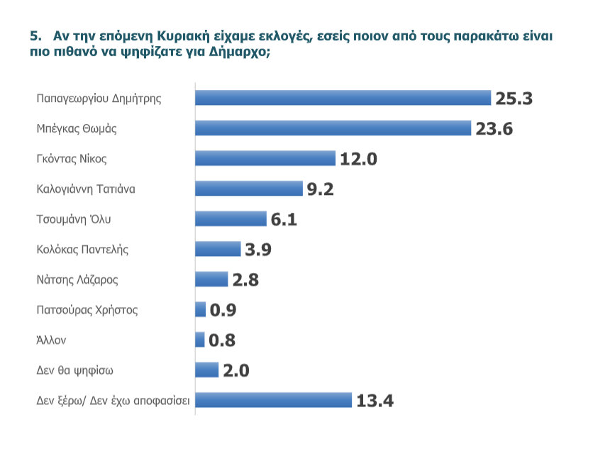 Η ερώτηση της πρόθεσης ψήφου προϊδεάζει για ένα εκλογικό ντέρμπι, με τον νυν δήμαρχο να διατηρεί ένα μικρό προβάδισμα στην παρούσα φάση με 25,3% έναντι 23,6% του κ. Μπέγκα.