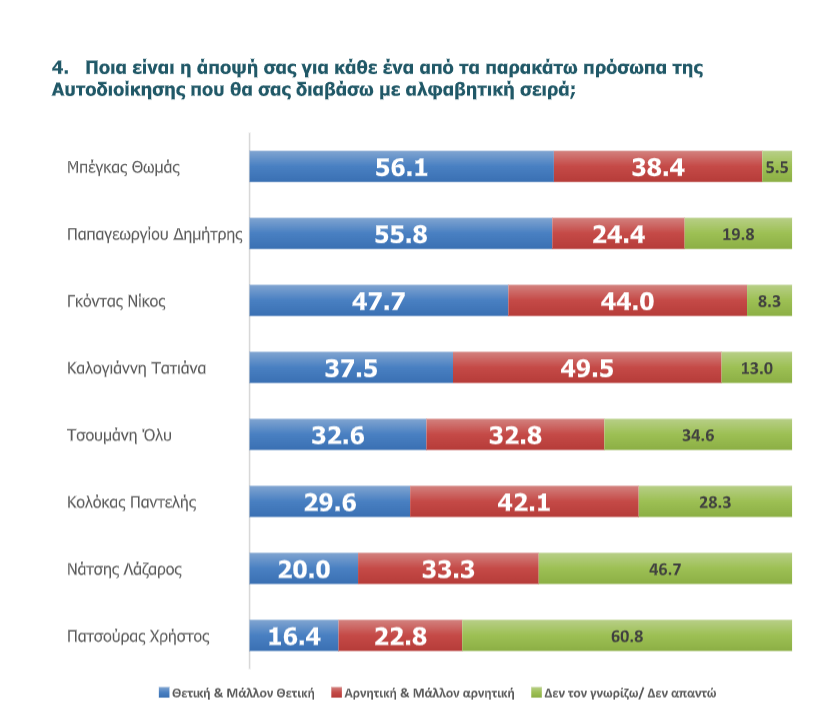 Σχετικά με τα ποσοστά δημοφιλίας των υποψηφίων στην πρώτη θέση των θετικών απόψεων είναι ο Θ. Μπέγκας με 56,1% και ακολουθεί ο Δημ. Παπαγεωργίου με 55,8%. Η ειδοποιός διαφορά, ωστόσο, μεταξύ των δύο εντοπίζεται στις αρνητικές απόψεις, όπου ο κ. Μπέγκας συγκεντρώνει το 38,4% έναντι 24,4% του κ. Παπαγεωργίου.