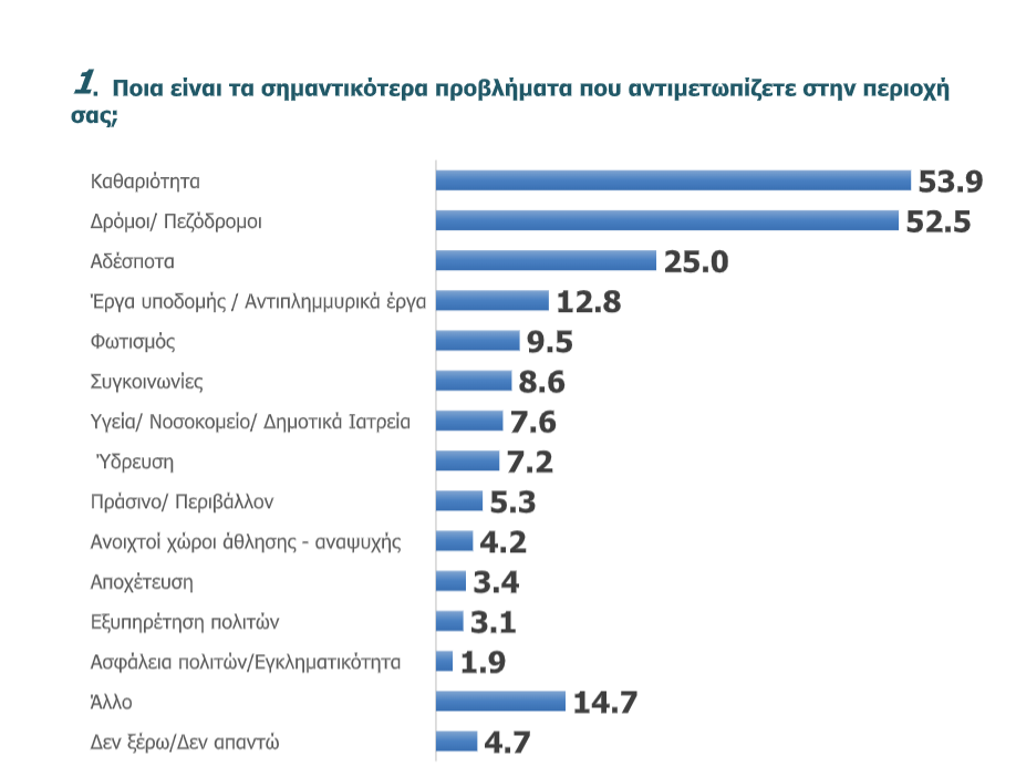 Στην ιεράρχηση των προβλημάτων οι πολίτες αναφέρουν ως μείζον ζήτημα την καθαριότητα και έπειτα την κακή κατάσταση δρόμων και πεζοδρομίων, ενώ ως ιδιαίτερο ζήτημα αναδεικνύεται η διαχείριση των αδέσποτων ζώων από το 25% των πολιτών.