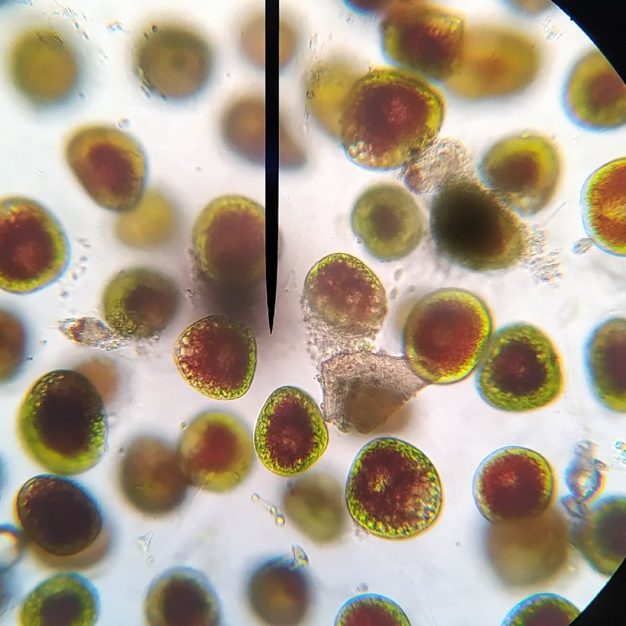 Ακολούθησε η μικροσκοπική παρατήρηση των δειγμάτων και παρατηρήθηκαν στην επιφανειακή αυτή μάζα να βρίσκονται εγκλεισμένα ένα πλήθος μικροφυκών και κυανοβακτηρίων. Ωστόσο, κυρίαρχο είδος είναι το χλωροφύκος, HaematococcuspluvialisFlotow (Chlorophyceae).