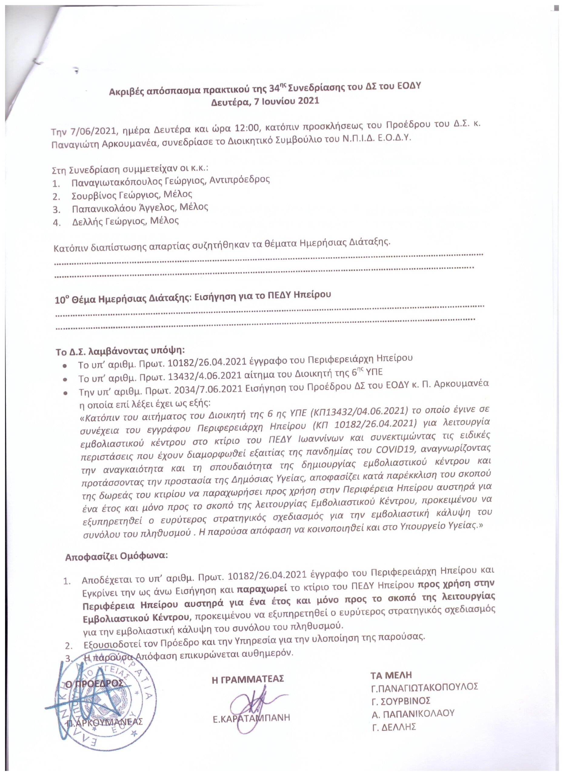 Την παραχώρηση του κτιρίου του ΠΕΔΥ προς χρήση στην Περιφέρεια Ηπείρου μετά από αίτημά της που είχε υποβληθεί στις 26 Απριλίου 2021 – καθώς και της 6ης ΥΠΕ στις 4 Ιουνίου 2021- αυστηρά για ένα χρόνο με σκοπό τη λειτουργία του ως Εμβολιαστικό Κέντρο, αποφάσισε στη συνεδρίαση της Δευτέρας 7 Ιουνίου το Διοικητικό Συμβούλιο του ΕΟΔΥ.